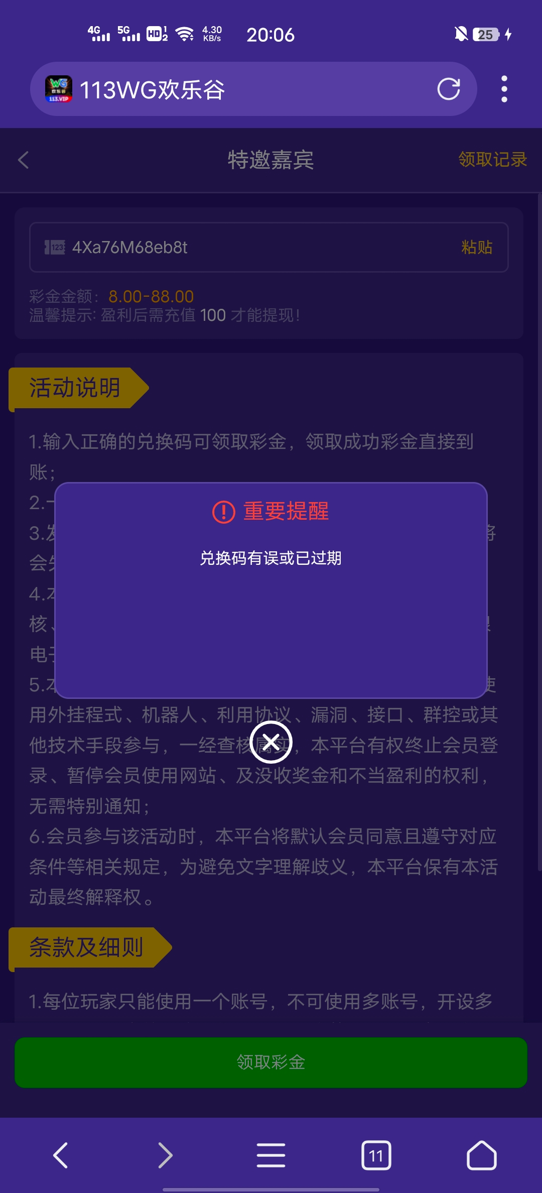 【彩金码限制只能玩WG电子,玩其他违规】