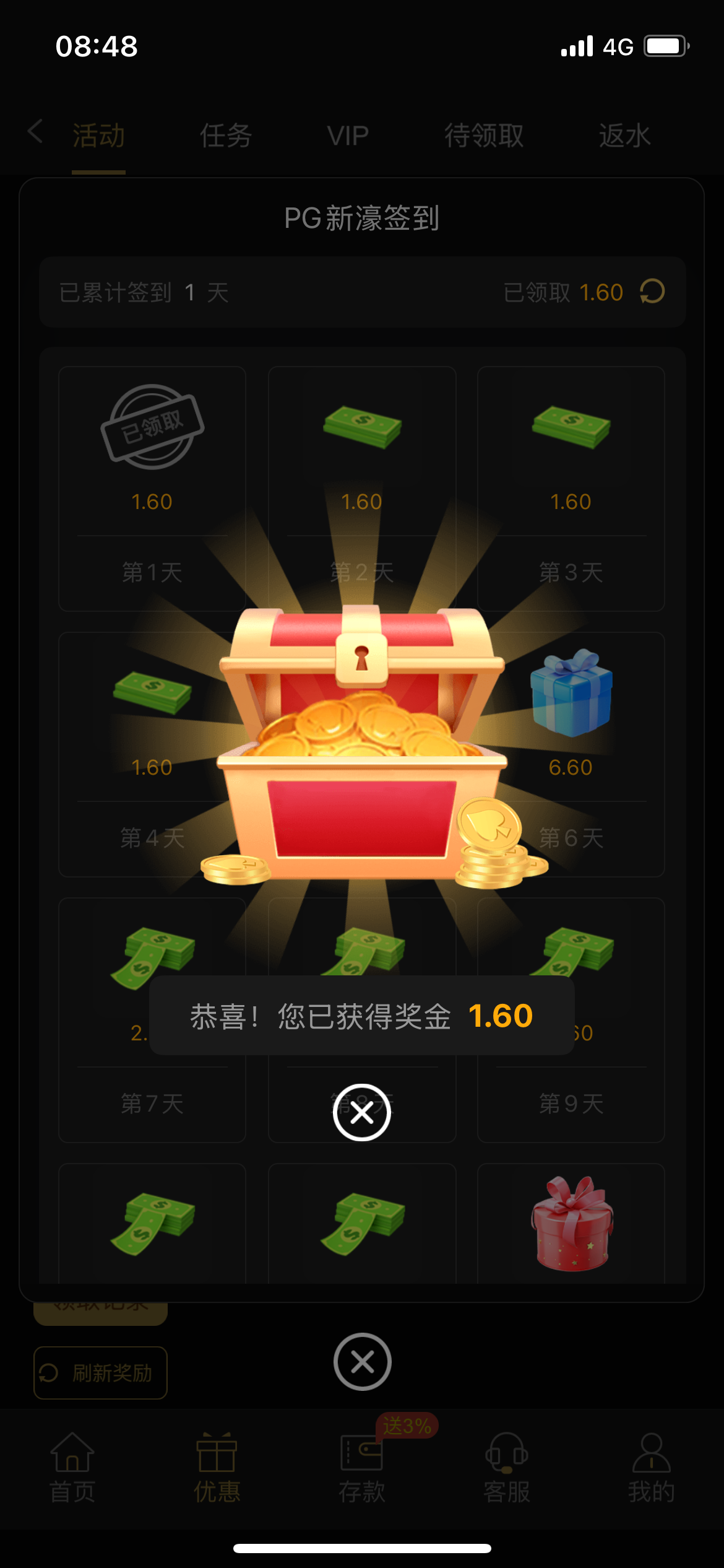 注册短信验证后第二天开始连续三天送6彩金,每天还有签到彩金