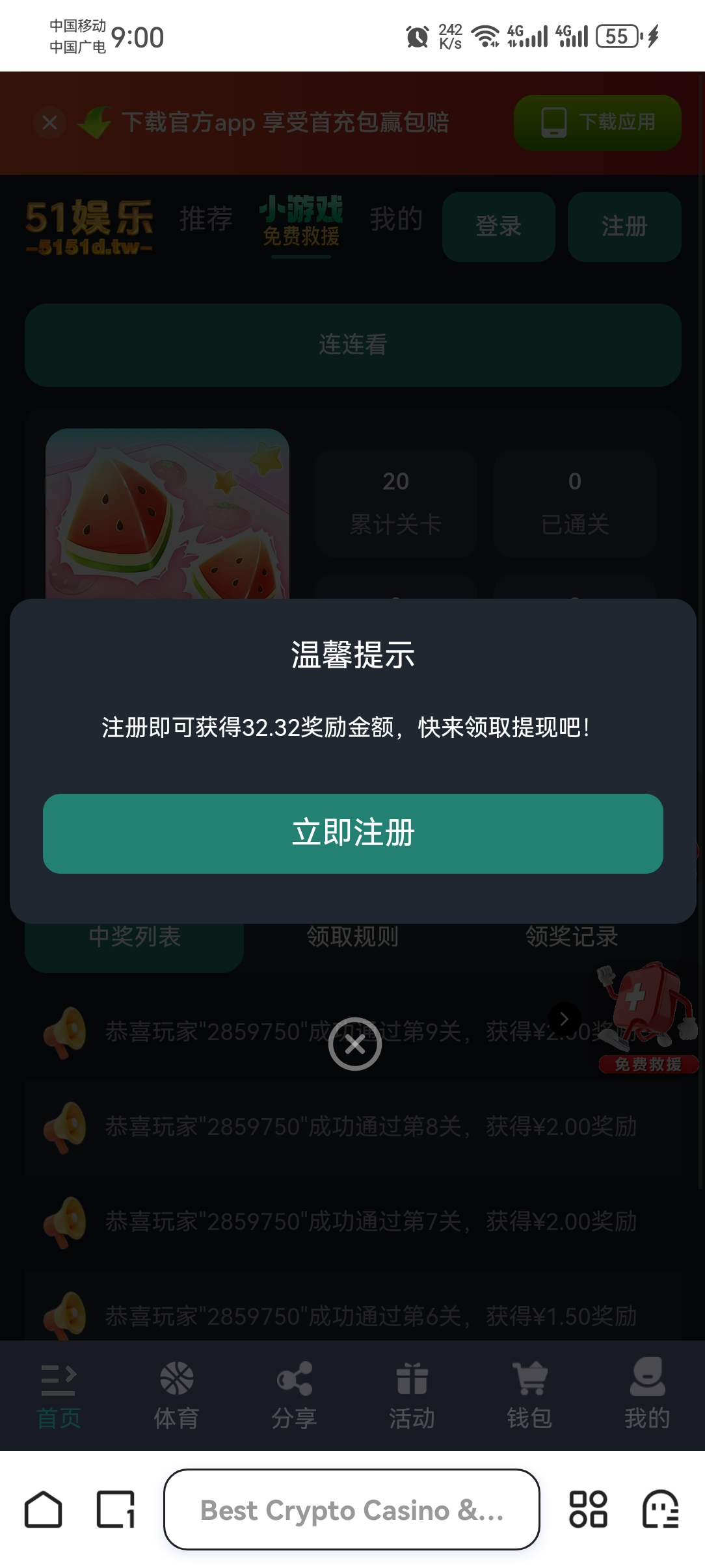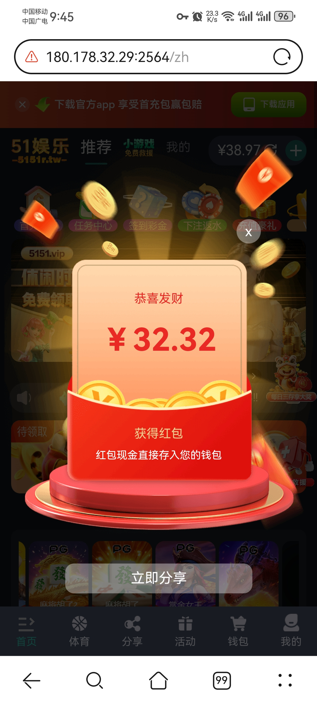 注册秒32,每天签到和小游戏可以赚十几块,50才能进游戏,可以开vpn无限撸,已成功出款
